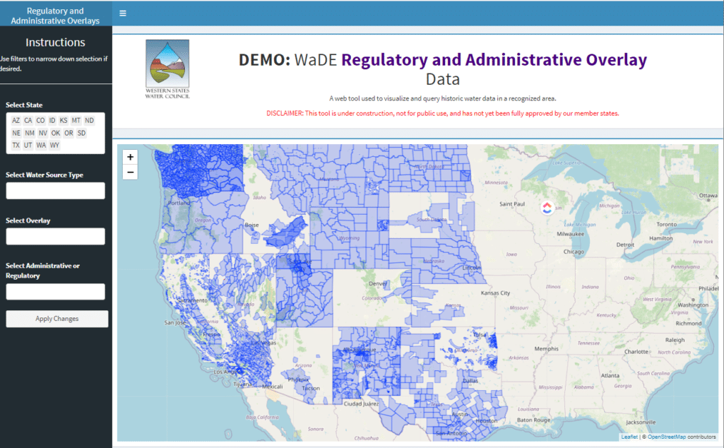 As a warning, these prototypes and their accompanying data are not for public use and have not fully been approved by our member states as the work we do is an iterative process with our member states. They are for demonstration use only to provide a roadmap of the direction we are taking in the development of WaDE and WestDAAT tools. In addition, it is important to note that individual state agencies use separate methods to estimate water use data. We casuin against making water use comparisons across state lines due to the different methods our states follow. Before drawing any conclusions or making comparisons at this time, be sure to consult with the state agency.